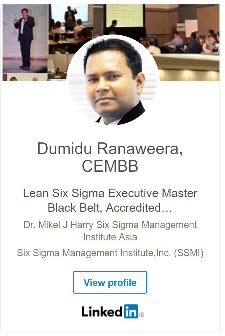 Dumidu is one of the well-known resources in the field of Lean Six Sigma and Organizational Excellence in the region and has been personally endorsed by the principal architect of Six Sigma Dr Mikel J. Harry as one of the best resources available on Six Sigma. He is featured frequently as a Keynote Speaker/ Chief Guest/Award Judge in many international and local forums and carries extensive expertise relating to Organizational Excellence.